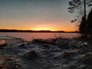 Hiljaisuudessa vallitessa, pikku pakkasessa, nukuimme kuin tukit lämpimien vällyjen välissä. Kaukana stressistä, kiireestä ja kotivelvoitteista. Eipä haitannut laavun alta kuulunut rapinakaan. Joku metsähiiri siellä varmasti nautti, kun meidän välittämä lämpö levisi senkin pesään. Niihin ajatuksiin nukahdin.